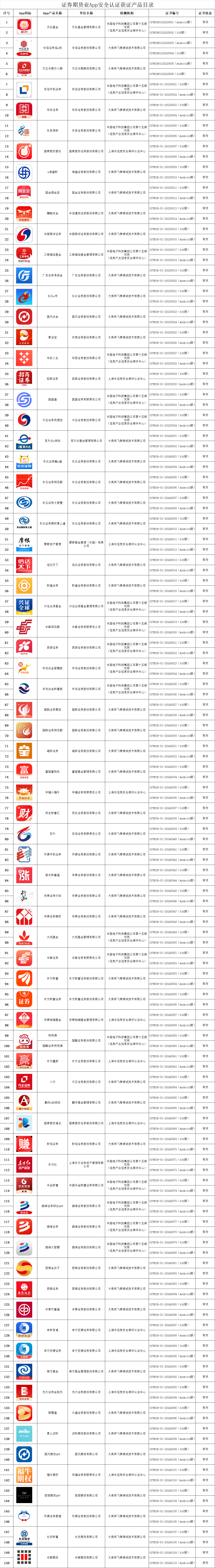 经过审核,大通证券股份有限公司的“智慧通”App、迈科期货股份有限公司的“掌上迈科”App、国元期货有限公司的“国元期货APP”App、华福证券有限责任公司的“福牛期权”App、西部期货有限公司的“西部期货APP”App、开源证券股份有限公司的“开源证券肥猫”App、长安期货有限公司的“长安财富”App、中辉期货有限公司的“中辉期货”App等符合行业标准《证券期货业移动互联网应用程序安全规范》(JR/T 0192-2020)及《证券期货业移动互联网应用程序安全检测规范》(JR/T 0240-2021)要求,通过证券期货业App安全认证,获得认证证书。