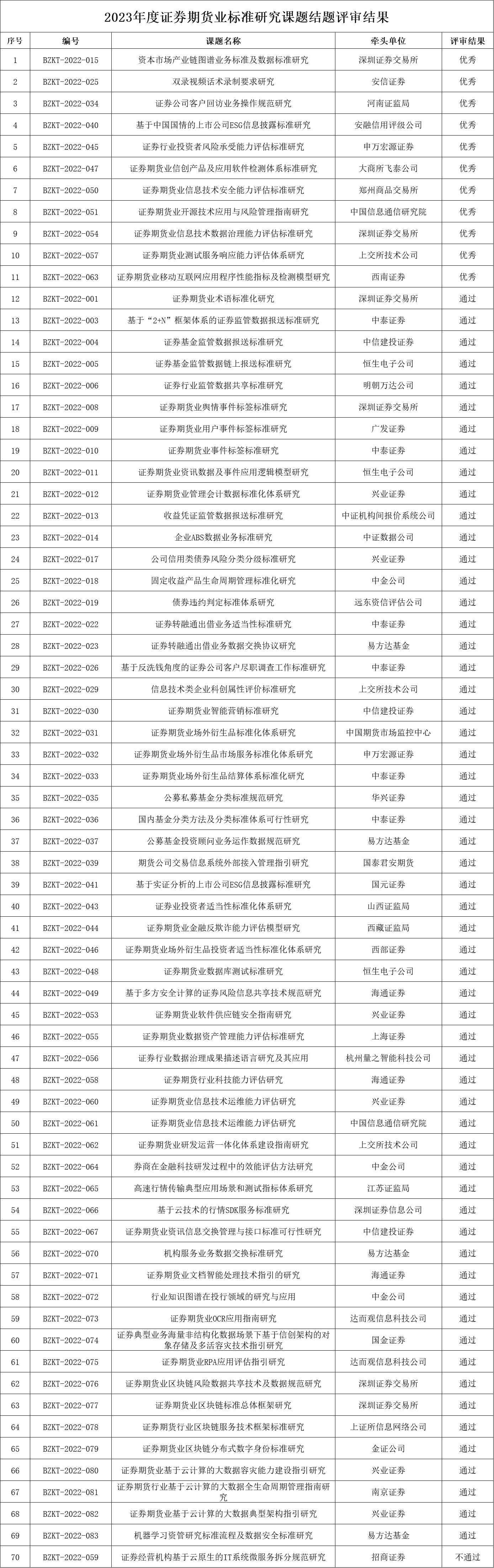 经证标委批准,2023年度证券期货业标准研究课题结题评审工作已完成,申请结题的70项课题中,11项研究课题评审结果为“优秀”,58项研究课题评审结果为“通过”,1项研究课题评审结果为“不通过”,现予以公布。
